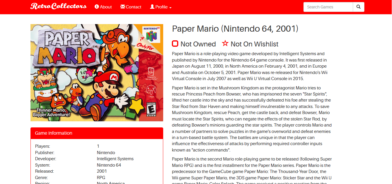 A game collector website that I am currently working on by myself. Site name and functionality is not final, but you can see a work in progress here. Final site will utilize:
